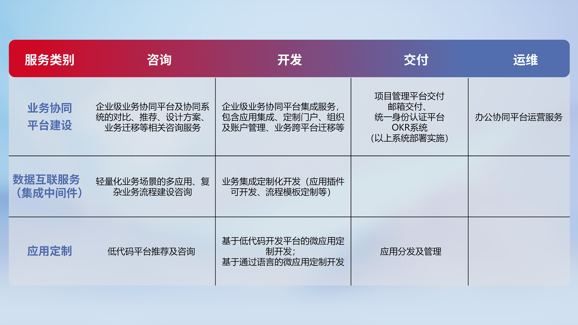 针对钉钉、、、、企微、、、IDaas等平台级产品提供产品的规划、、、、方案、、、交付、、、、定制化开发等服务,,,,实现如统一协同办公、、、、智能客户服务、、混合会议管理、、、智能数据查询、、、、等业务场景,,实现数字化转型。。。。